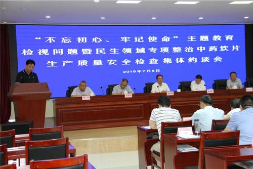 为认真贯彻落实“不忘初心、牢记使命”主题教育相关要求,深入开展自治区民生领域专项整治中药饮片生产质量安全整治工作,2019年7月5日上午,自治区药品监督管理局召集全疆27家中药饮片生产企业50余人,召开“不忘初心、牢记使命”主题教育检视问题暨民生领域专项整治中药饮片生产质量安全检查集体约谈会。公司