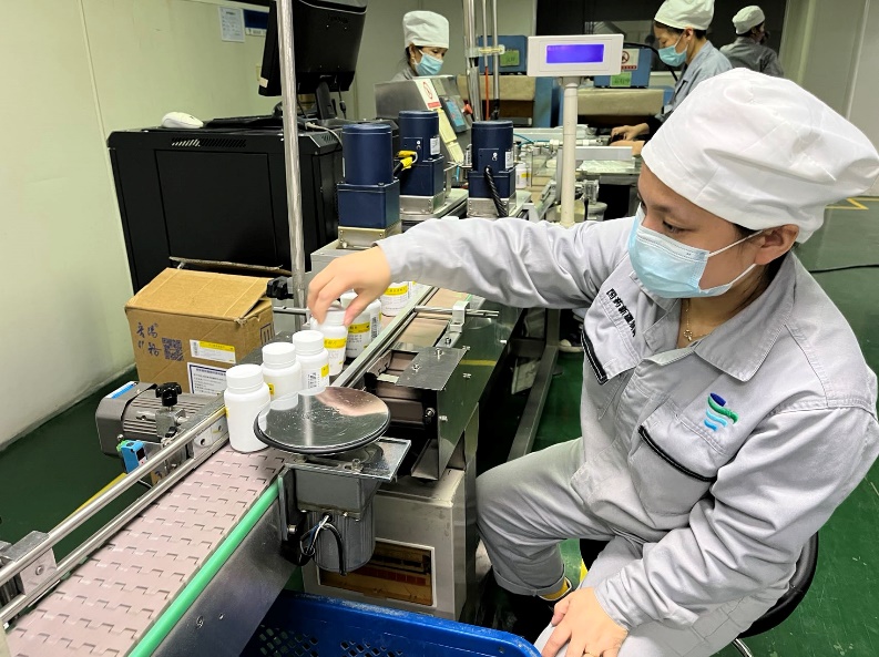 在包装车间,康文丽双眼紧盯着传送带上的一个个药瓶,作为贴签岗位操作人员,她的工作是检查每个药瓶上印有生产日期、生产批号、有效期的标签贴得是否符合要求。8年的工作经验让她练就了一双“火眼金睛”,一眼就能看出哪个瓶盖没有旋盖好,哪个标签没有贴到位。
